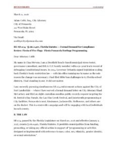 Excerpt: Formal demand served on Pensacola City Attorney Adam Cobb targeting the City’s decades-long municipal support for the Fiesta of Five Flags / Fiesta Pensacola — one of the oldest heritage festivals in Florida. The demand identifies three independent statutory triggers under § 166.04971: official action (the Mayor’s annual “Surrender of the City” ceremony), public funding (Downtown Pensacola Improvement Board payments, City service costs), and municipal promotion (Visit Pensacola). Demands a written compliance review, corrective action guidance, and production of public records within 30 days.