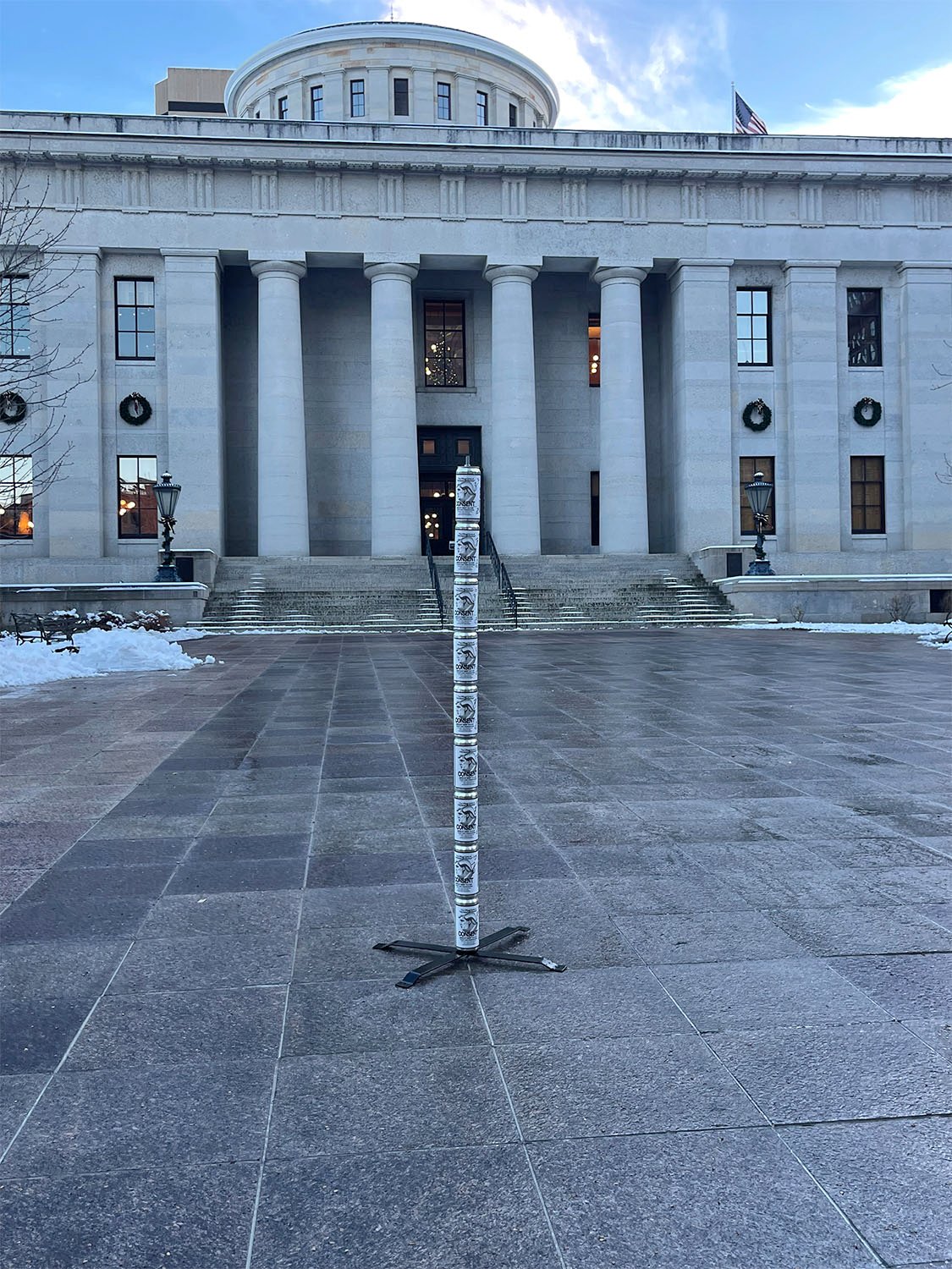 It is a physical artifact associated with a temporary public installation consisting of a freestanding aluminum pole and an accompanying explanatory placard, filed and approved through standard state procedures.